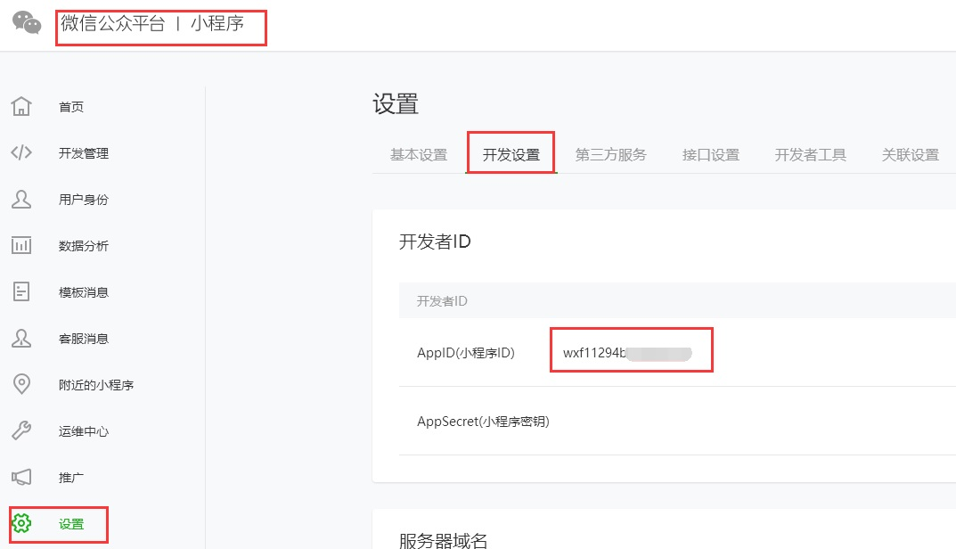 1、微信小程序核对地址为:设置-开发设置 有显示具体 appid,如图: